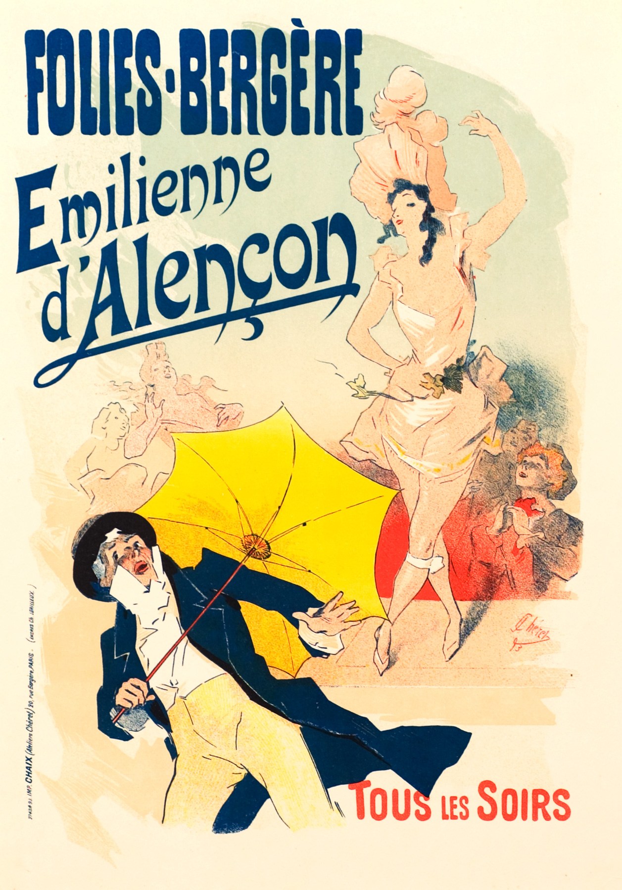 A superb impression of the definitive state from the edition on this paper (there was also a small edition on Japan paper). Transcribed from Chéret’s 1893 poster of the same title by artisans at Atelier Chéret and issued as plate 113 (of 256) in the series Le Maîtres de l’Affiche, bearing the blindstamp of the program (Lugt 1777c) in the sheet lower right. Published by Jules Chéret; printed at Impremiere Chaix (Atelier Chéret), Paris.